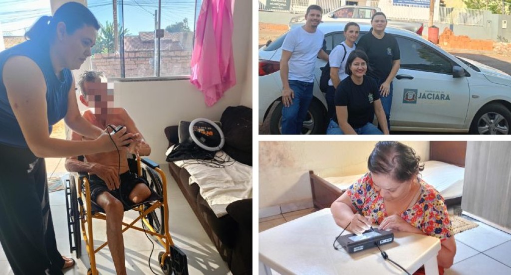 #DescriçãodaImagem: Montagem com três fotografias que retratam a ação de atendimento domiciliar realizada pela 14ª Zona Eleitoral em Jaciara. À esquerda, uma servidora da Justiça Eleitoral coleta os dados biométricos de um eleitor em cadeira de rodas, dentro de sua residência. No canto superior direito, quatro servidores da Justiça Eleitoral posam em frente a um carro oficial da Prefeitura de Jaciara, parceiro na iniciativa. No canto inferior direito, uma eleitora sentada à mesa realiza a coleta biométrica por meio de equipamento portátil.