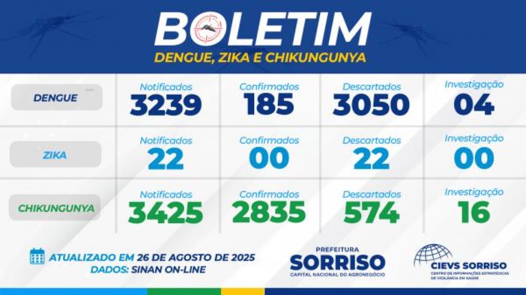 •Zika: Em relação ao vírus Zika, o boletim registra 22 notificações. É importante salientar que todas essas notificações foram descartadas, não havendo, até o momento, nenhum caso confirmado da doença no município.