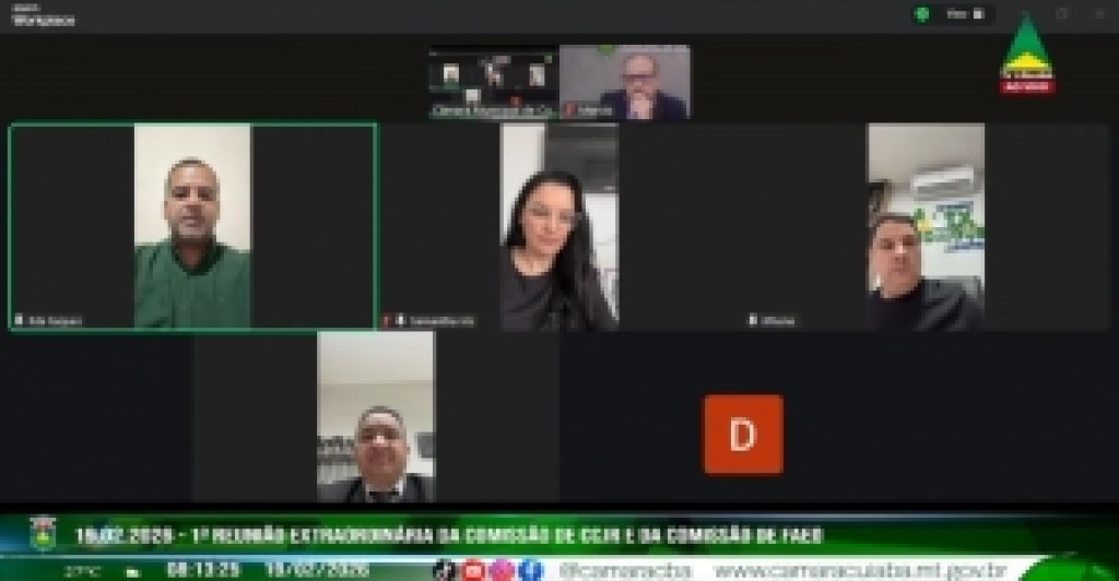 As comissões de Constituição, Justiça e Redação (CCJR) e a de Fiscalização e Acompanhamento da Execução Orçamentária (CFAEO) da Câmara Municipal de Cuiabá se reuniram de forma conjunta, em reunião extraordinária realizada de forma on-line, na manhã desta quinta-feira (19). Estiveram presentes no encontro, pela CCJR os vereadores Samantha Iris (PL), presidente da comissão, e Marcrean Santos (MDB), vice-presidente. Representando a CFAEO, o presidente da comissão, vereador Ilde Taques (PSB) e o vice-presidente, vereador Alex Rodrigues (PV).
