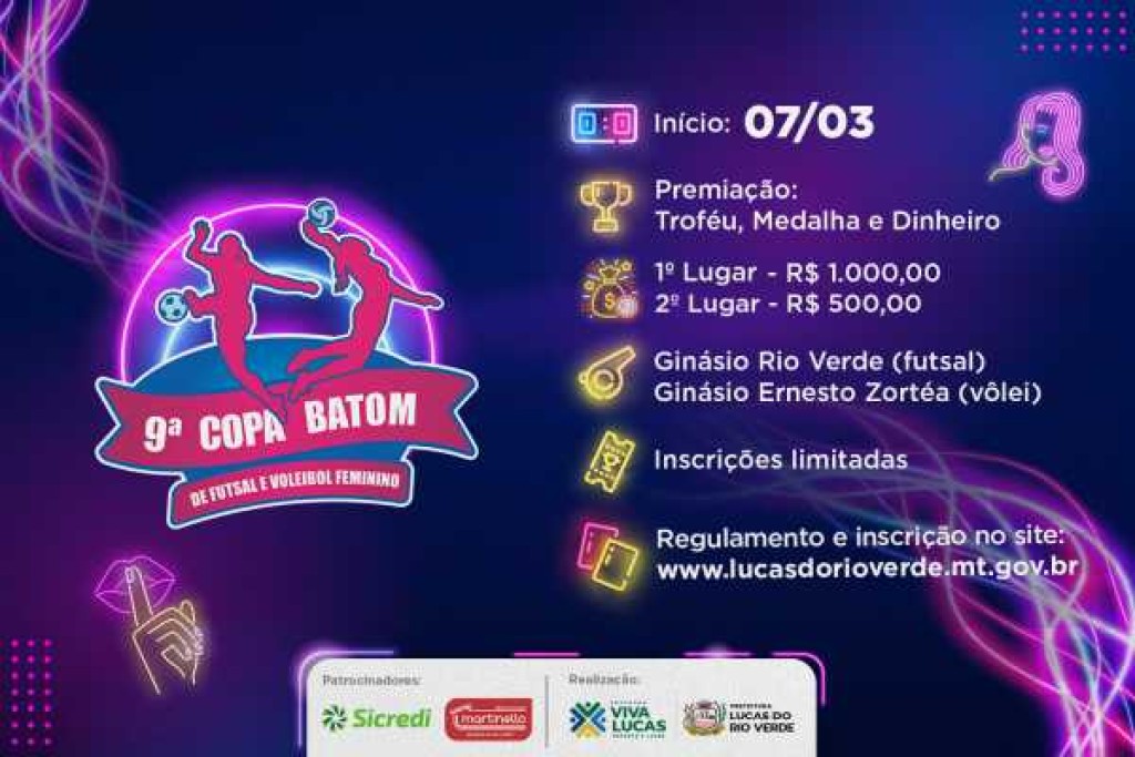 No mês dedicado as mulheres, a Prefeitura de Lucas do Rio Verde, por meio da Secretaria de Esporte e Lazer, também promoverá, entre as atividades do mês, um evento direcionado ao público feminino na área esportiva. A 9ª edição da Copa Batom de Futsal e Voleibol será disputada em três dias.