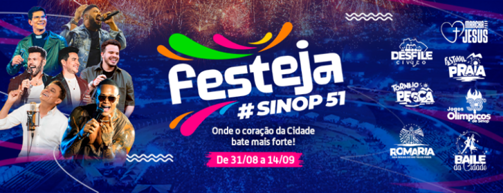 Entre os dias 31 de agosto e 14 de setembro, a Prefeitura de Sinop realiza o Festeja Sinop 51, um dos maiores eventos já organizados na história do município. Com o tema “Onde o coração da cidade bate mais forte”, a programação reunirá atrações nacionais, atividades esportivas, manifestações religiosas e culturais, além de momentos tradicionais que fazem parte da identidade da Capital do Nortão.