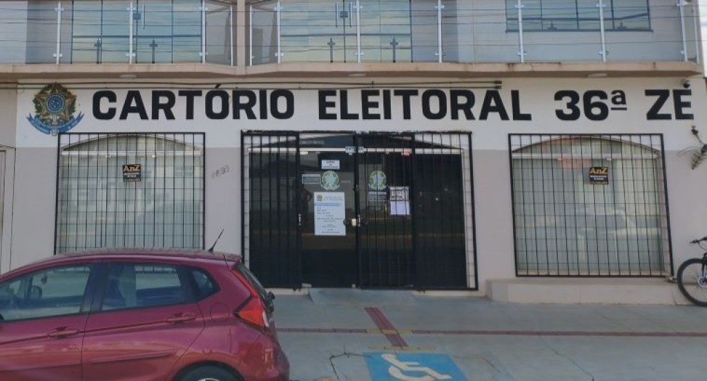 #PraTodosVerem: A imagem mostra a fachada do Cartório da 36ª Zona Eleitoral. A porta e as janelas são de vidro, com portão e grades pretas na frente. No letreiro, está escrito em cor preta “CARTÓRIO ELEITORAL 36ª ZE”, ao lado do símbolo da Justiça Eleitoral. Em frente ao prédio, há um carro vermelho estacionado.