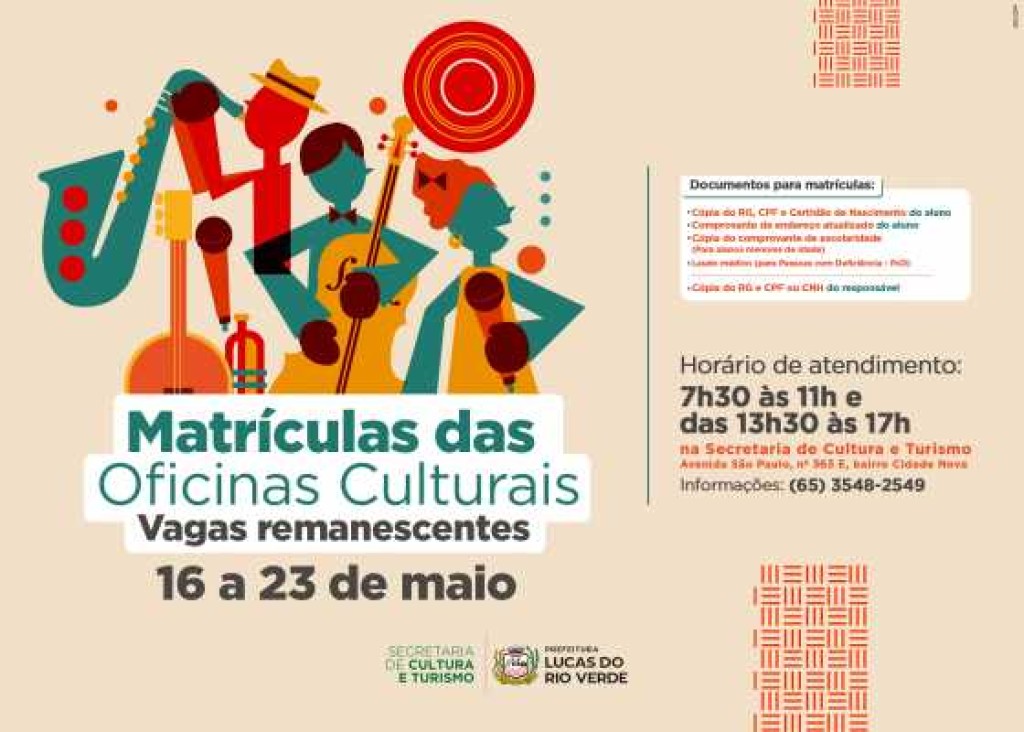 A Secretaria de Cultura e Turismo de Lucas do Rio Verde anunciou a abertura de vagas remanescentes para diversas oficinas culturais. As aulas são gratuitas e organizadas conforme a faixa etária, atendendo crianças, adolescentes e adultos do município.