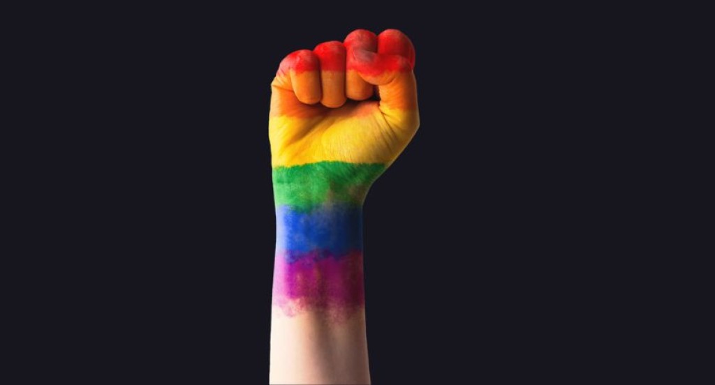 #PraTodosVerem – A imagem mostra um punho fechado erguido, símbolo de resistência e luta, com a mão e parte do braço pintados com as cores do arco-íris, representando a bandeira LGBTQIAPN+. O fundo é preto, o que destaca ainda mais as cores vibrantes da mão, reforçando a mensagem de orgulho, força e reivindicação de direitos da comunidade.
