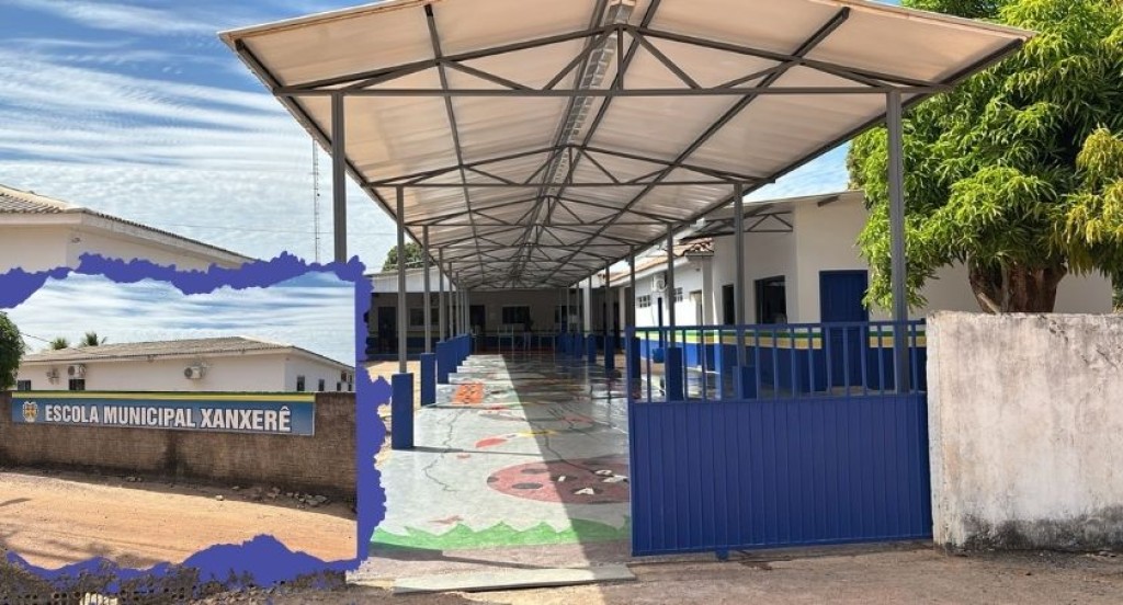 #PraTodosVerem: A imagem mostra a fachada e a entrada coberta da Escola Municipal Xanxerê. Em primeiro plano, há um portão azul aberto que dá acesso a uma área coberta com piso decorado com desenhos infantis. A estrutura metálica do telhado cobre o corredor central que leva aos prédios da escola, pintados de branco com detalhes em azul. À esquerda, há um destaque com o nome da escola em uma placa azul fixada em um muro baixo.