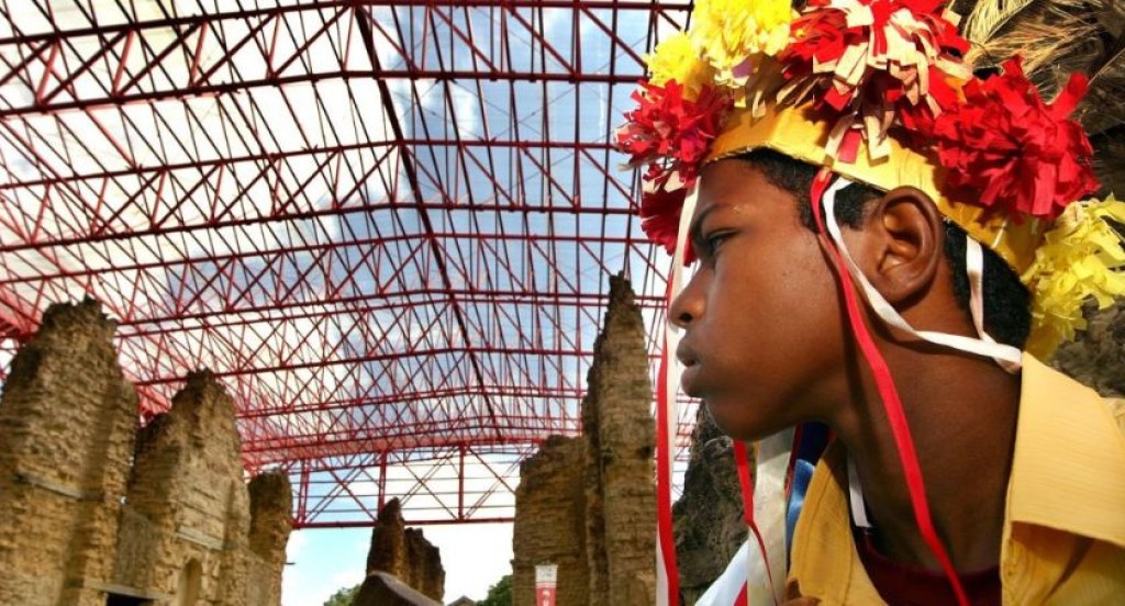 #PraTodosVerem – A imagem mostra um jovem com cocar colorido de penas vermelhas e amarelas, fitas brancas e vermelhas, em primeiro plano. Ao fundo, aparecem ruínas da Igreja Matriz de Vila Bela da Santíssima Trindade de pedra, cobertas por uma grande estrutura metálica vermelha com telhas translúcidas, que protegem o patrimônio histórico. A cena remete à preservação cultural e histórica, unindo tradição indígena e arquitetura colonial no oeste de Mato Grosso.