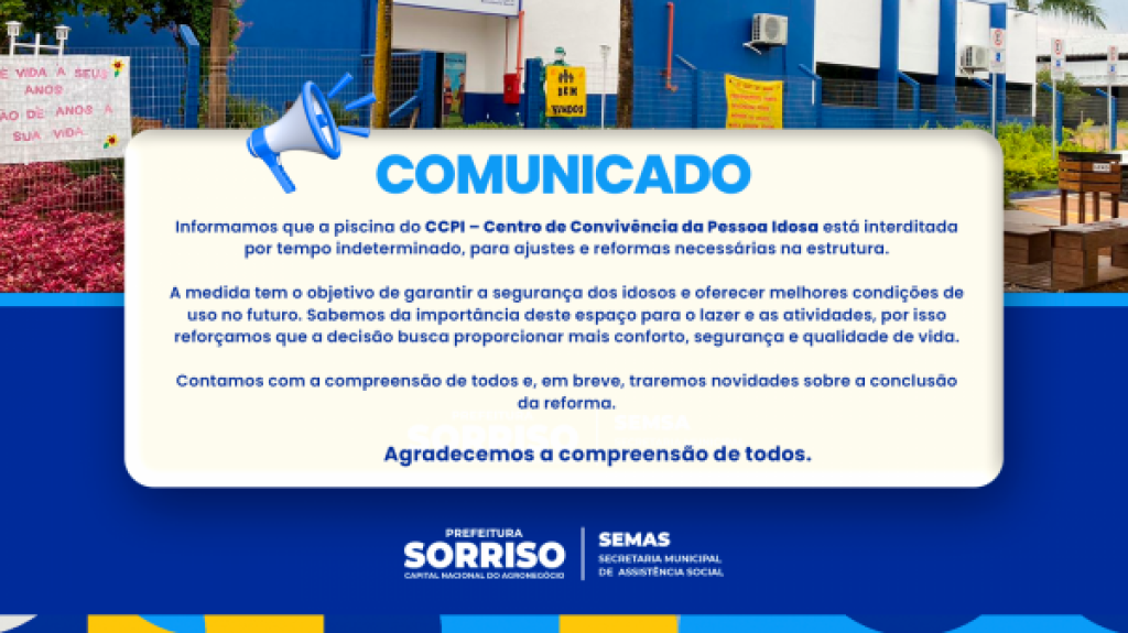 A piscina do Centro de Convivência da Pessoa Idosa (CCPI) foi interditada por tempo indeterminado nesta quarta-feira, 17 de setembro, para a realização de reformas e ajustes necessários na estrutura. A decisão foi tomada pela Secretaria Municipal de Assistência Social, com início imediato da interdição.