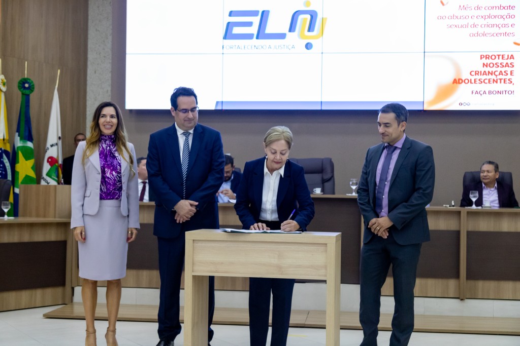 #Paratodosverem – Esta matéria possui recursos de texto alternativo para inclusão das pessoas com deficiência visual. Primeira imagem: Foto horizontal colorida. Em uma mesa, a presidente Clarice Claudino assina o termo de cooperação. Ao lado dela estão os juízes Tulio Duailibi, Débora Caldas e Gleidison Grisoste. Ao fundo está um telão com a arte do Projeto Elo. Segunda imagem: Desembargadora Clarice Claudino da Silva faz uso da fala no púlpito. Terceira imagem: Juíza da Segunda Vara Criminal Débora Pain Caldas conversa com a equipe da TV.Jus. Quarta imagem: Nova facilitadora dos círculos de paz Nara Cristina de Oliveira Barbosa.