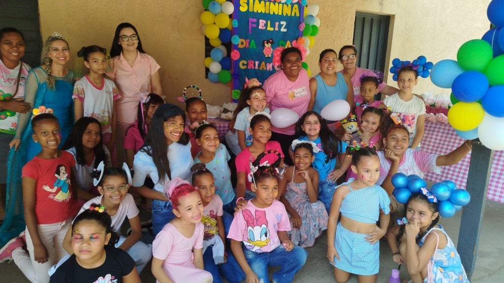 A imagem mostra a celebração do Dia das Crianças nas unidades do Programa Siminina do bairro Carumbé e Três Barras.