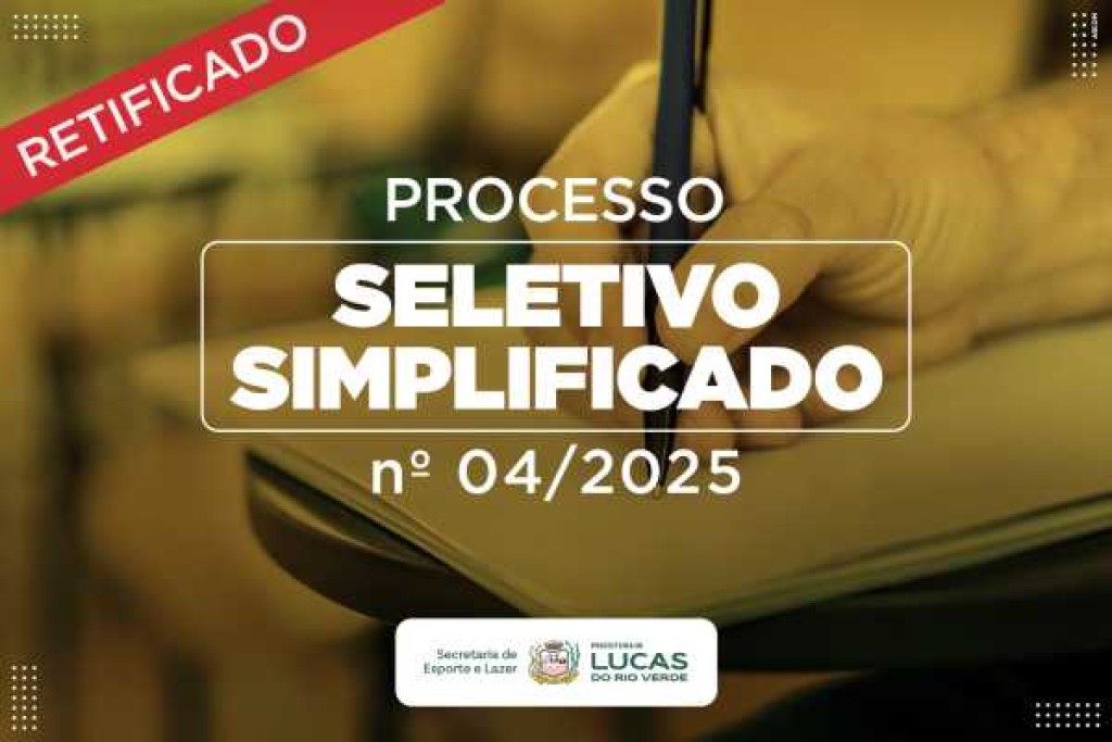A Prefeitura de Lucas do Rio Verde informa que, por meio da Secretaria de Governo e Administração, publicou, nesta quinta-feira (23), a Retificação 01/2025 do Processo Seletivo Simplificado – Edital 04/2025, que trata sobre seleção para contratação temporária e formação de cadastro reserva para atuação na Secretaria de Esporte e Lazer.