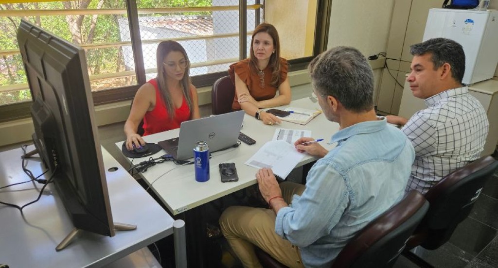 #PraTodosVerem: A imagem mostra quatro pessoas reunidas em uma sala de trabalho. Elas estão sentadas ao redor de uma mesa com notebook, documentos e um monitor grande virado para o grupo. A cena sugere uma reunião ou discussão técnica, em um ambiente de escritório, com janelas ao fundo e armário ao lado.