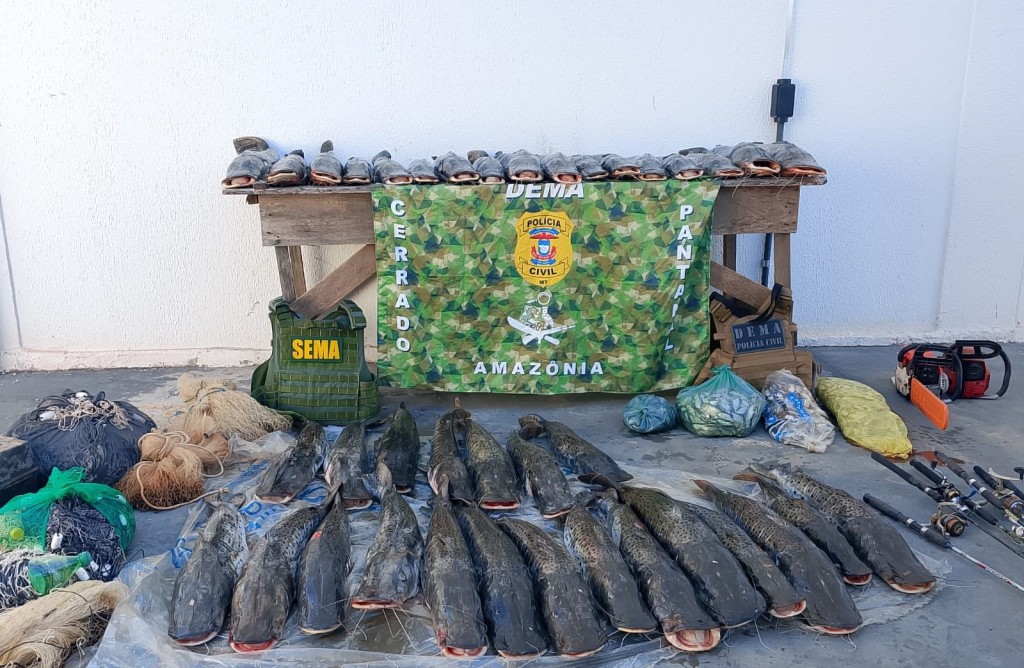 A Coordenadoria de Fiscalização de Fauna da Sema (Sema), em conjunto com a Delegacia Especializada do Meio Ambiente (Dema) apreendeu 235 quilos de pescado, entre eles 36 pintados e 2 cacharas, que são espécies de captura proibida pela legislação vigente. O flagrante ocorreu no município de Barão de Melgaço e a infratora foi multada em R$31,5 mil.