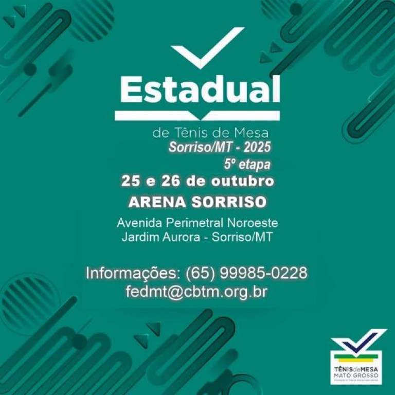 A Arena Sorriso recebe, neste sábado (25) e domingo (26), a 5ª etapa do Campeonato Estadual de Tênis de Mesa. O evento é promovido pela Federação de Tênis de Mesa de Mato Grosso (FTMM) e reunirá 253 atletas inscritos em diversas categorias.