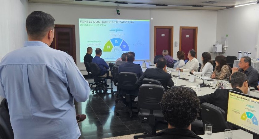 #PraTodosVerem: A imagem mostra uma reunião em uma sala equipada com projetor, onde várias pessoas estão sentadas ao redor de uma mesa retangular acompanhando uma apresentação. No telão, o slide exibe o título “Fontes dos dados utilizados na análise do PCA” e um gráfico circular com ícones representando diferentes categorias de informação. O assessor do Núcleo de Gestão de Licitações, Maksen Augusto do Nascimento, aparece de costas e está de pé, de camisa azul, observando e apresentado a tela enquanto o grupo presta atenção à explanação.