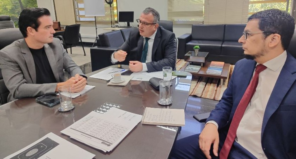 #PraTodosVerem: A imagem mostra três homens em trajes sociais sentados ao redor de uma mesa de reunião, envolvidos em uma conversa séria e focada. Um deles gesticula com as mãos enquanto fala, sugerindo que está explicando ou argumentando sobre algum tema. Sobre a mesa, há copos com água, papéis impressos, anotações e uma xícara de café, indicando um encontro de trabalho. O ambiente é organizado, com poltronas ao fundo, iluminação natural e decoração corporativa, reforçando o caráter institucional da reunião.