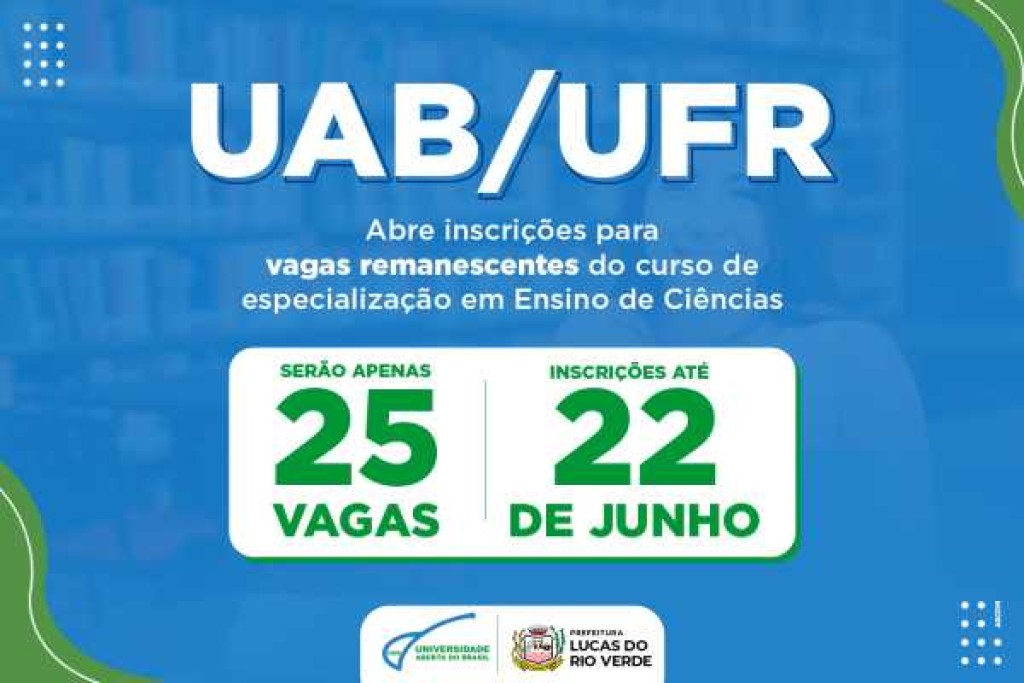 A Universidade Aberta do Brasil (UAB), polo de Lucas do Rio Verde, está com inscrições abertas para as vagas remanescentes do curso de especialização em Ensino de Ciências. O curso, ofertado pela Universidade Federal de Rondonópolis (UFR), é gratuito e será realizado na modalidade de Educação a Distância (EaD).